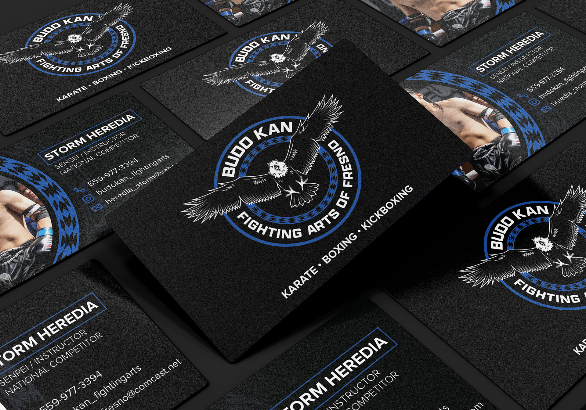 This logo was created for Budo Kan Fighting Arts of Fresno, a gym offering karate, boxing, and kickboxing. The design incorporates the owners' Native American heritage, with a prominent eagle and a subtle tribal pattern. These cultural elements honor their background while keeping the focus on the gym’s martial arts expertise.