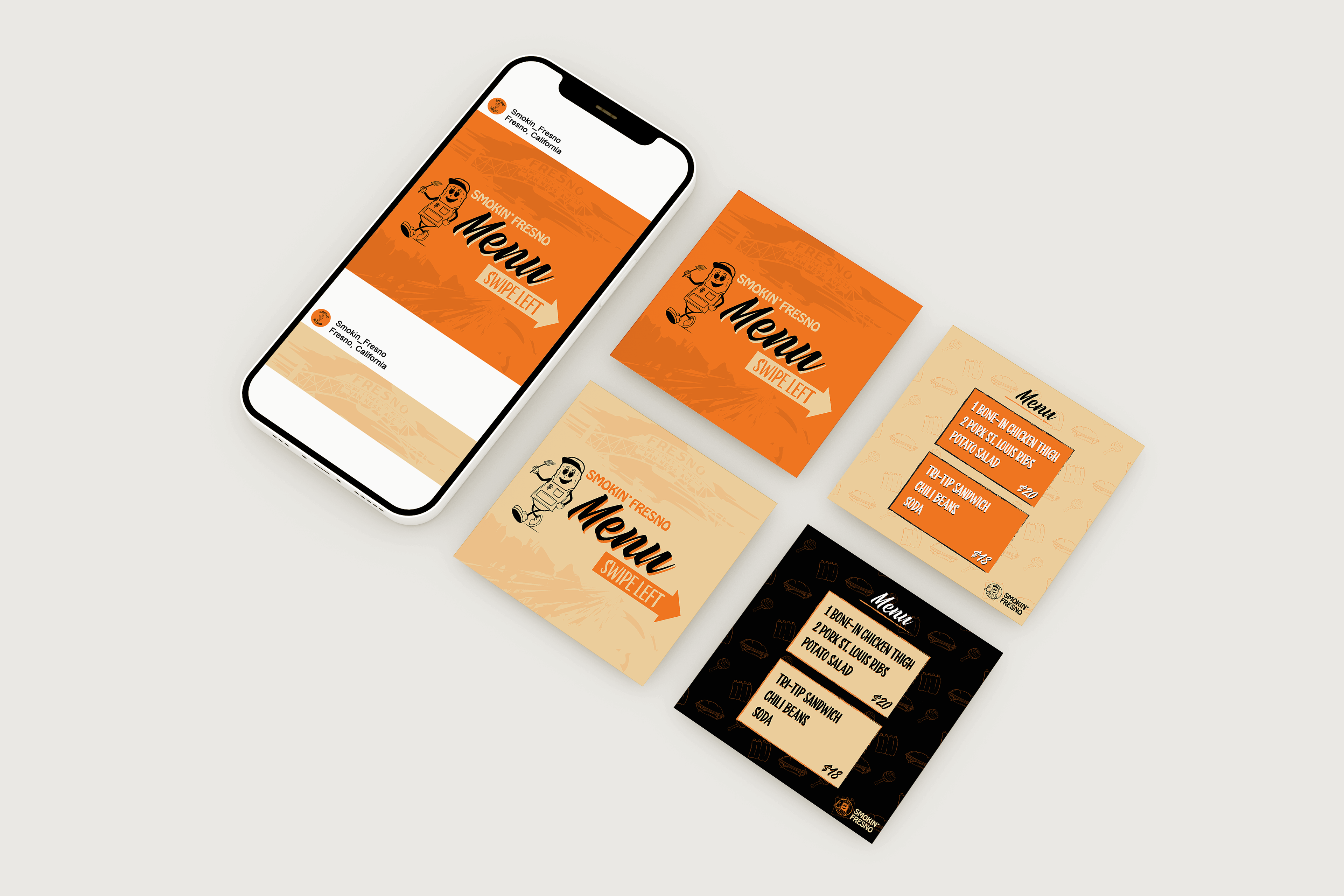 Retro-style logo and branding for Smokin Fresno, a BBQ business in Fresno, CA, centered around a custom mascot. The mascot represents the owner and highlights his unique use of pickled jalapeños and pickles in his recipes.